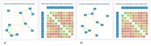 Y a continuación se presentan los gráficos y las matrices de similitud obtenidos con SensoGraph en una de las asignaturas, para los conceptos específicos analizados (A) y para las imágenes generadas con IAG (B) a partir de los conceptos.